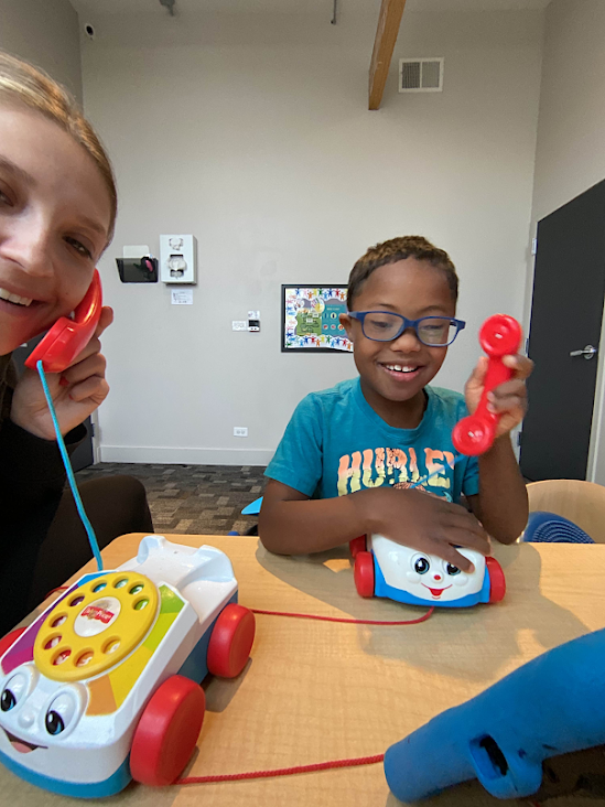 • Comprehensive Evaluation: Our SLPs start by getting to know your child with play-based assessments in our welcoming West Loop clinic, your home, your child’s daycare, or even virtually through telehealth. This personalized evaluation identifies your child’s strengths and areas for growth while easing anxiety and making your child feel comfortable.